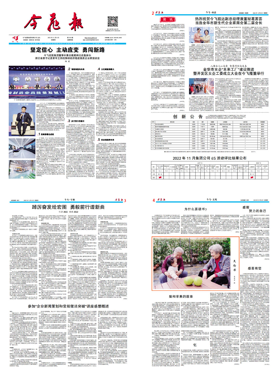 坚定信心 主动应变 勇闯新路,今飞控股集团董事长兼总裁葛炳灶应邀参加浙江省委书记袁家军主持的推动经济稳进提质企业家座谈会简讯热烈祝贺今飞凯达副总经理兼董秘葛茜芸当选金华市新生代企业家商会第二届会长八婺女儿心向党 智慧科创向未来,金华市女企“未来工厂”建设推进暨开发区女企工委成立大会在今飞隆重举行创新公告2022年11月份集团公司6S活动评比结果公布踔厉奋发绘宏图 勇毅前行谱新曲参加”企业新闻策划和常规做法突破”讲座感想概述为什么要读书?感谢, 努力的自己感恩有您梨和苹果的故事忆