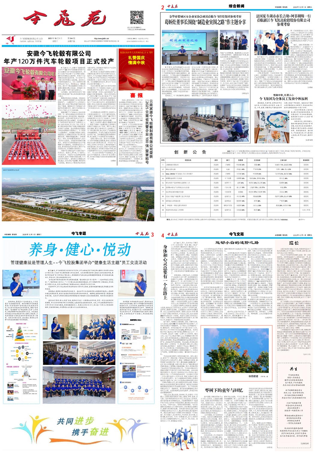 安徽今飞轮毂有限公司年产120万件汽车轮毂项目正式投产云南富源今飞轮毂制造有限公司荣获“2025云南省民营企业100强”荣誉称号金华市婺城区女企业家协会成员莅临今飞控股集团参观考察 葛炳灶董事长围绕“制造业突围之路”作主题分享创 新 公 告法国夏斗湖市市长吉勒•阿菲胡斯一行莅临浙江今飞凯达轮毂股份有限公司参观考察情满中秋,礼暖人心——今飞集团为全体员工发放中秋福利养身•健心•悦动 管理健康就是管理人生——今飞控股集团举办“健康生活主题”员工交流活动运动小白的进阶之路身体和心灵总要有一个在路上成长枣树下的童年与回忆共生