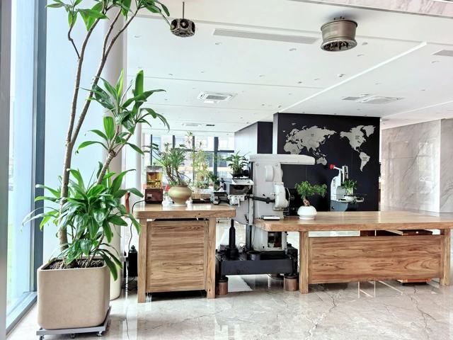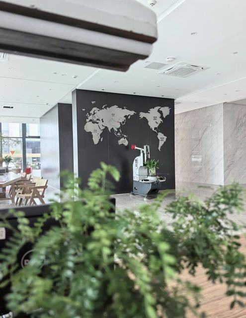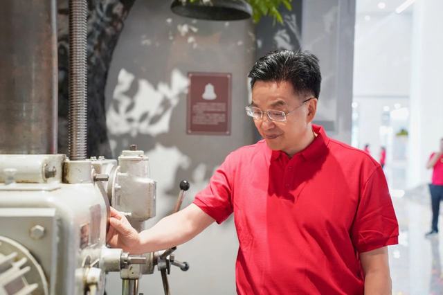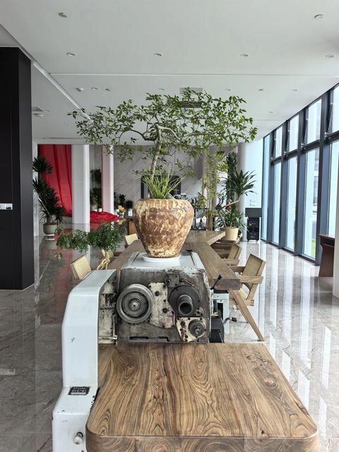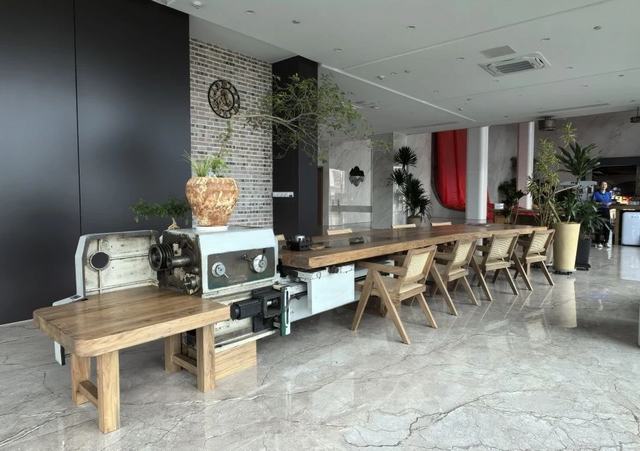 集团总部大楼于2023年6月建设,2024年11月28日进场装修,历时2年的时间完成建设及装修,大楼的设计装修体现了许多“今飞元素”,大厅以绿色可持续理念为脉络,将承载时光记忆的60年代老设备巧妙解构重组,让老设备与温润质朴的原木相遇,让带有岁月包浆的机械部件重生为茶桌的艺术支撑,金属的冷冽硬朗与木质的自然温厚相互碰撞,既延续着工业文明的厚重底蕴,又以创新形态诠释着生态与人文共生的美学哲学,让每一处空间肌理都诉说着企业过去与未来的对话。