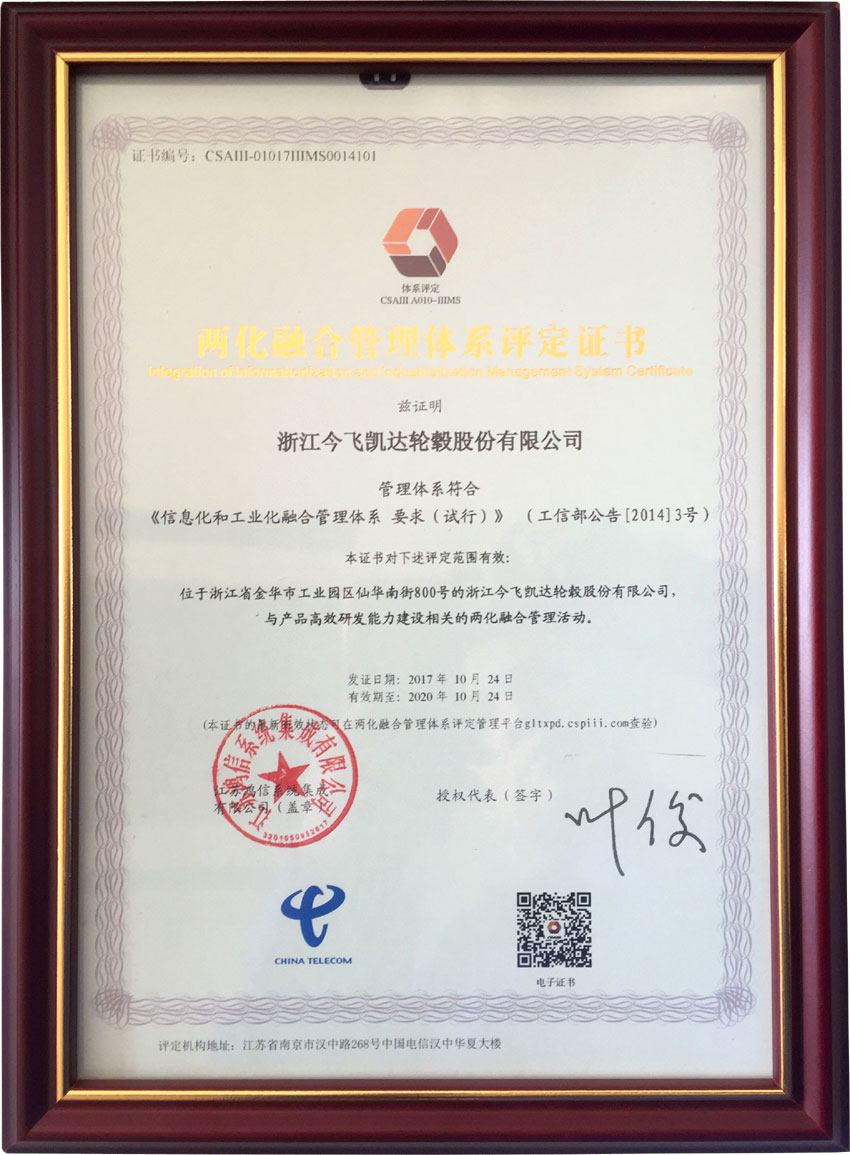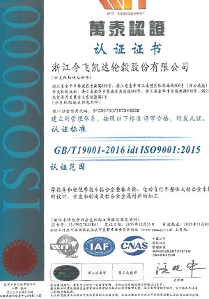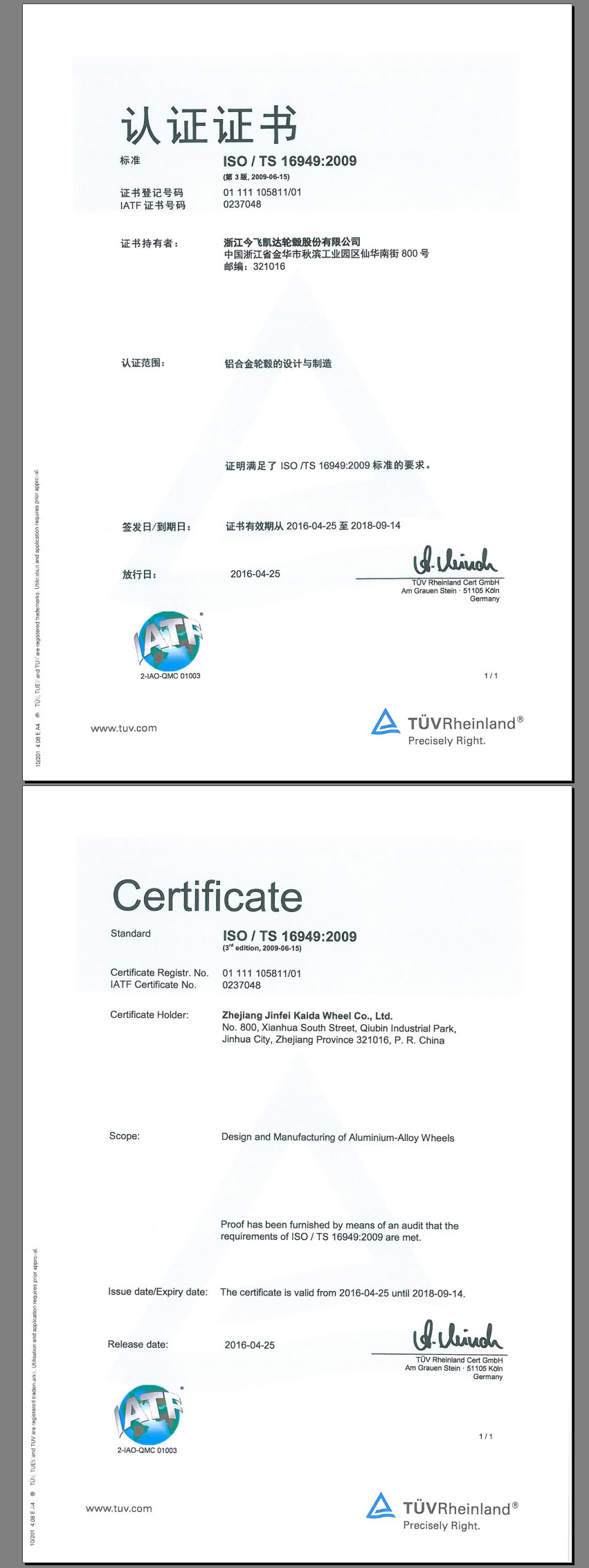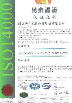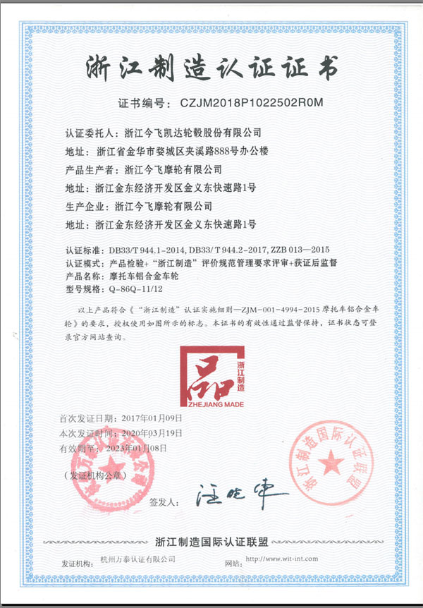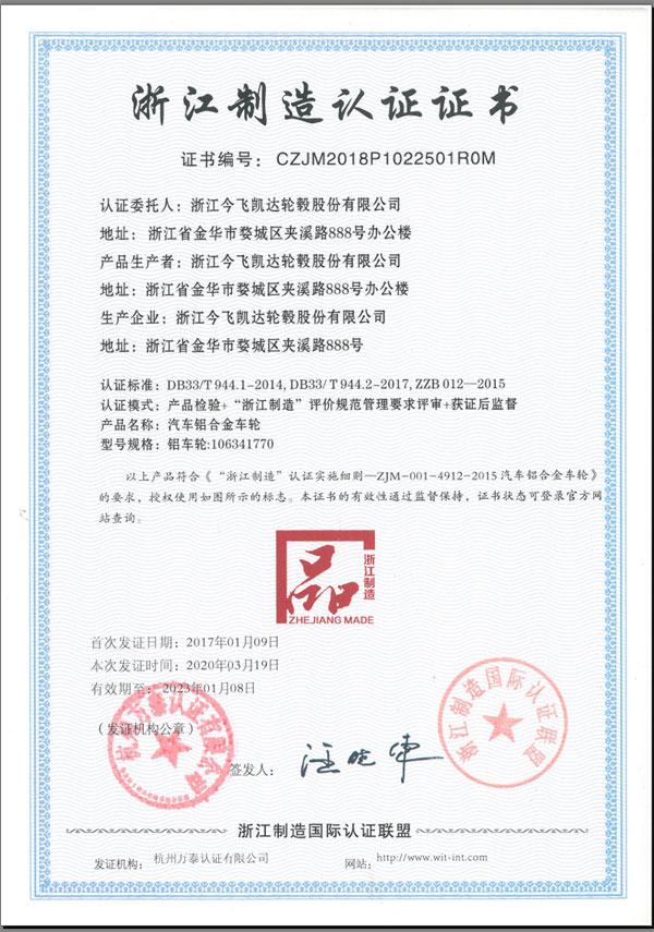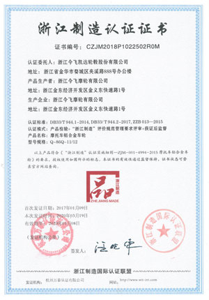 今飞控股集团始终视产品质量为生命, 以体系为依托,实现产品零缺陷,逐步确立了“今飞”铝合金车轮国际品牌地位。