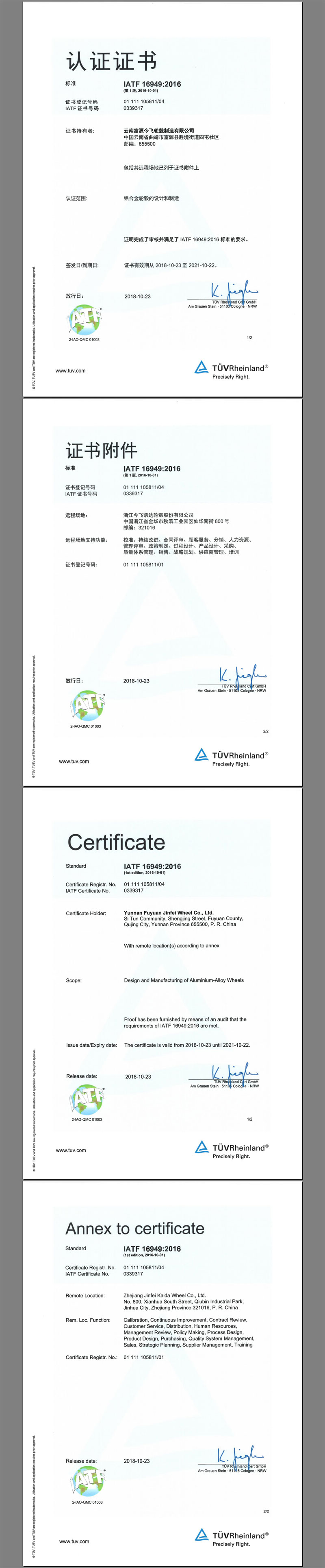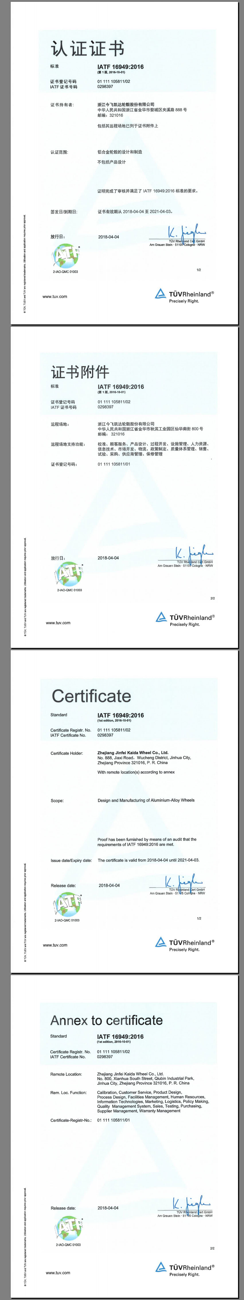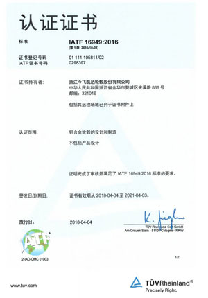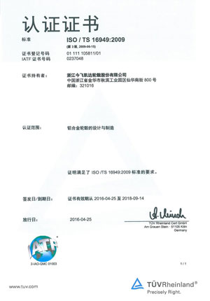 TS16949今飞凯达仙华南街工厂质量管理体系认证证书